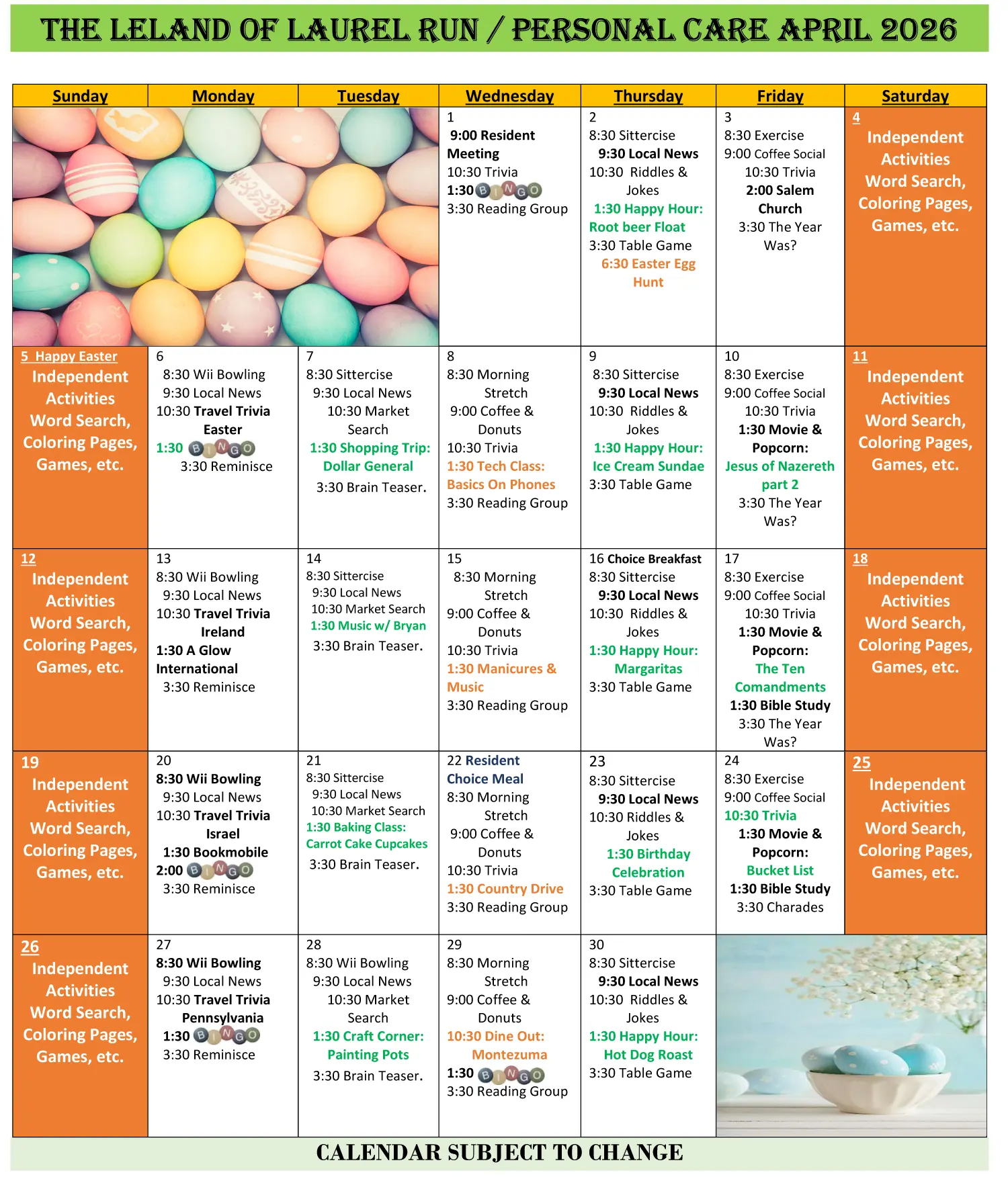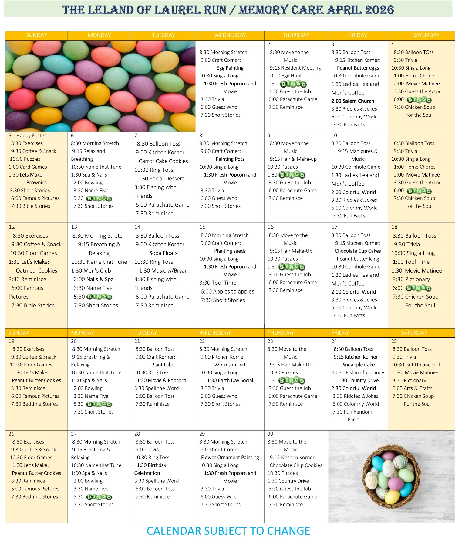 Memory Care Activity Calendar